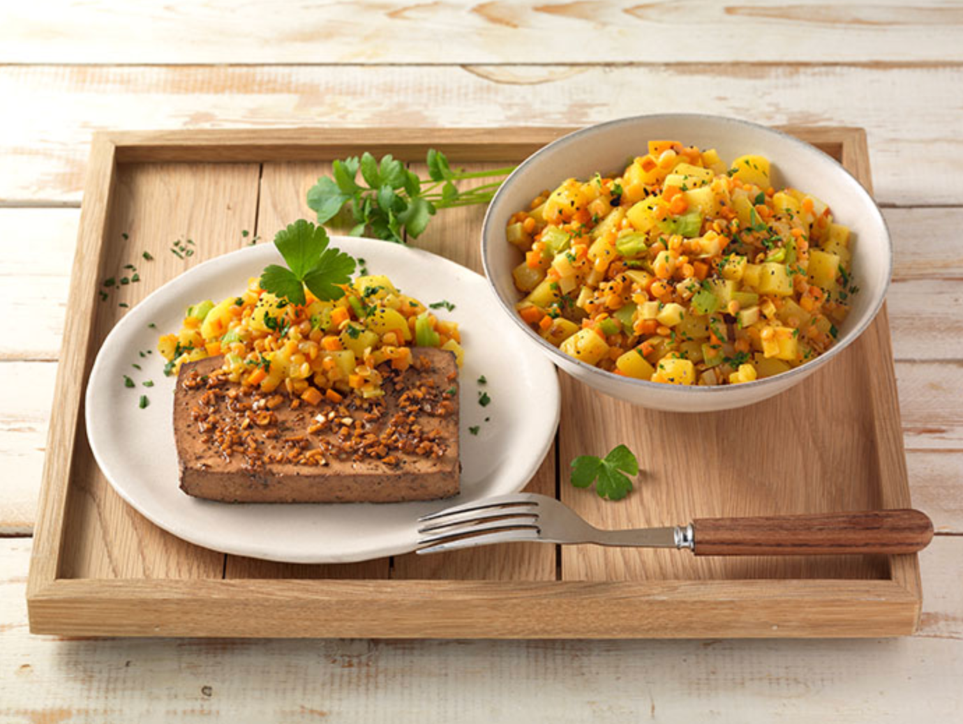 - Schep het linzengroentemengsel met de tofu op twee borden.