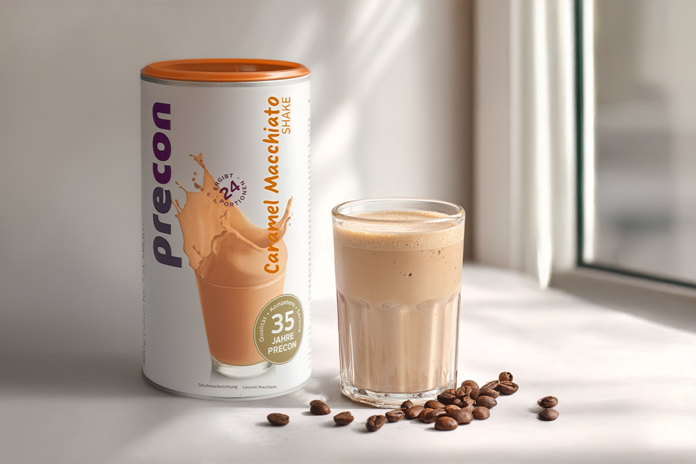 Seguro al objetivo: 1x Precon + 2 comidas a tu gusto. Después de 4–6 semanas disfrutas comidas completamente normales – y te mantienes en equilibrio.