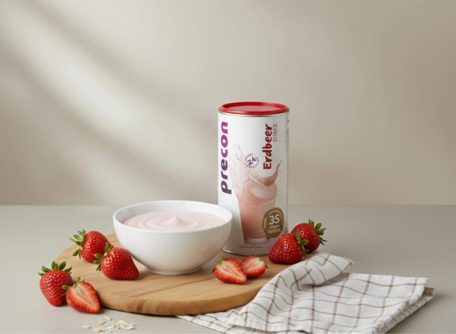 Seguro al objetivo: 1x Precon + 2 comidas a tu gusto. Después de 4–6 semanas disfrutas comidas completamente normales – y te mantienes en equilibrio.
