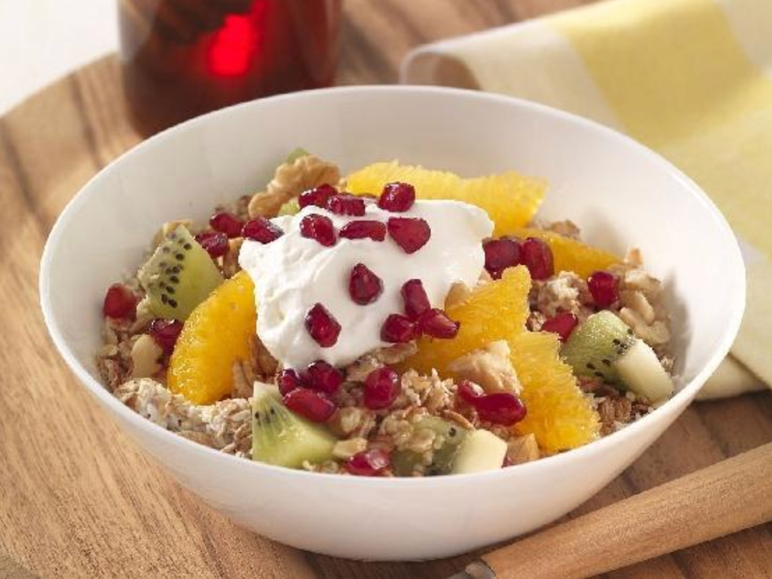 - Répartir le muesli dans deux grands bols à muesli. Décorer avec la crème fouettée et les graines de grenade.