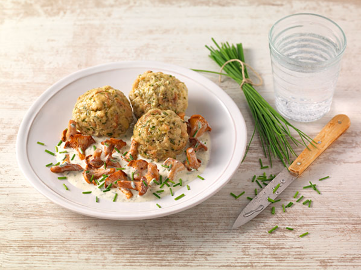 - Dresser les champignons à la crème sur deux assiettes et y déposer les boulettes de pain.