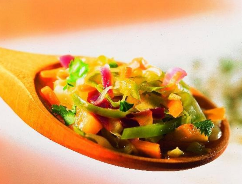 Putenbrust auf Radieschen-Champignongemüse mit buntem Blattsalat und Heidelbeer-Sorbet