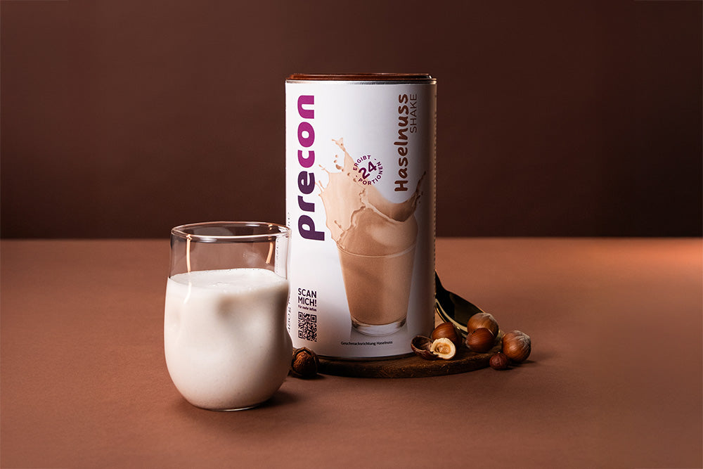 Ein cremiges Glas Precon Haselnuss-Shake steht neben seinem Behälter auf einer braunen, mit Haselnüssen bestreuten Fläche vor einem Hintergrund mit warmem Braun.