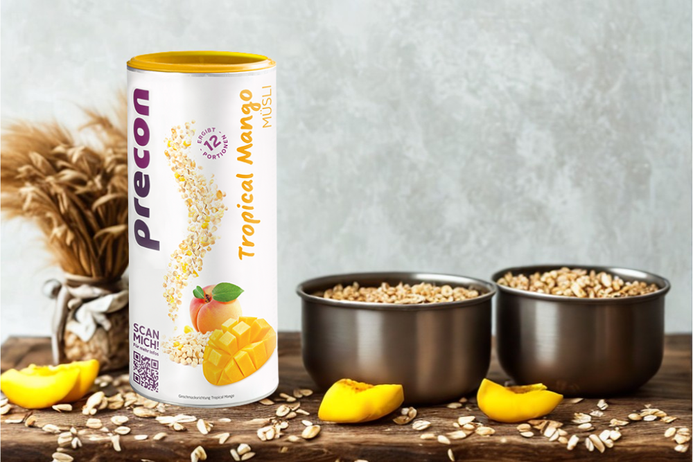 - 40 g (3 afgestreken maatscheppen) Precon Tropical Mango muesli in een kom doen.
